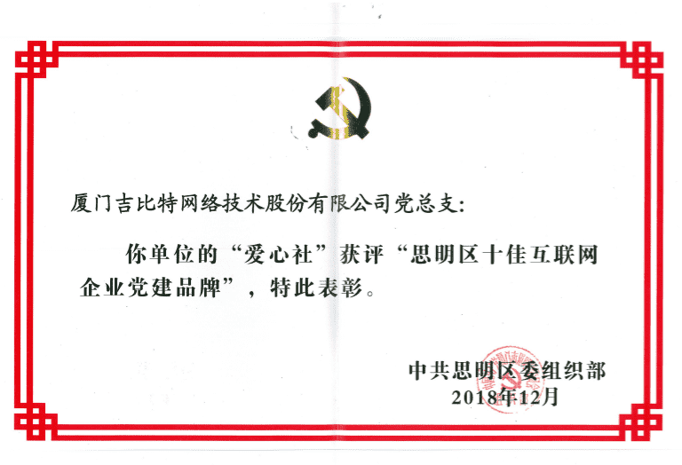 经初审评选、、、网络评选和专家评审等环节,,"厦门yaxin111网络技术股份有限公司党总支-爱心社" 从全区28个参评党建品牌中脱颖而出,,,,获评"思明区十佳互联网企业党建品牌"。。。。